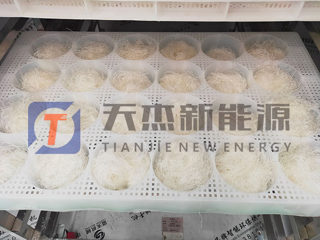 將清理加工后的粉條均勻規(guī)則的放入烘盤磨具中盛制阜陽粉條烘干機設(shè)備內(nèi)調(diào)好參數(shù)準備烘干。