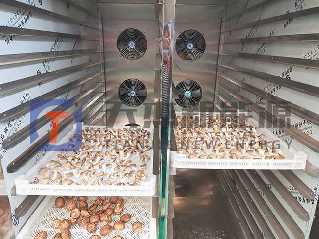 1、預(yù)備烘干期:在蘑菇烘干箱溫度為35℃的熱風中烘干1—4小時,使蘑菇含水量降到15-20%