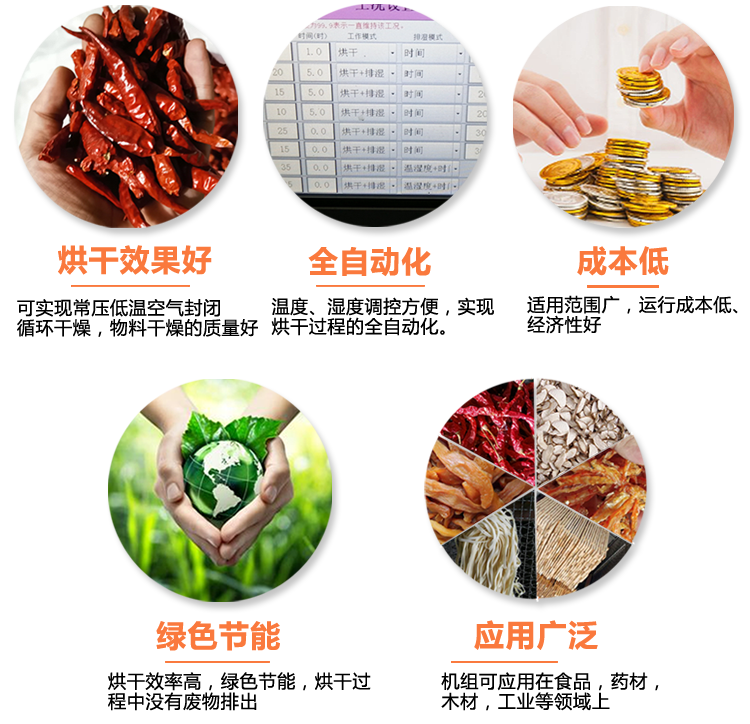 熱泵烘干機(jī)烘干出來的物料效果好,可實(shí)現(xiàn)常壓低溫空氣封閉循環(huán)干燥,物料干燥的質(zhì)量好。全自動(dòng)化,烘干過程中的溫度濕度調(diào)控方便,實(shí)現(xiàn)烘干過程的全自動(dòng)化。一機(jī)多用,適用范圍廣,運(yùn)行成本低,經(jīng)濟(jì)性好。烘干過程中沒有廢物排出,綠色節(jié)能,烘干效率高。熱泵烘干機(jī)可應(yīng)用在食品,藥材,木材,工業(yè)等領(lǐng)域上。歡迎您聯(lián)系我們了解中藥材烘干機(jī)、辣椒烘干機(jī)、香菇烘干機(jī)、金銀花烘干機(jī)等更多產(chǎn)品。